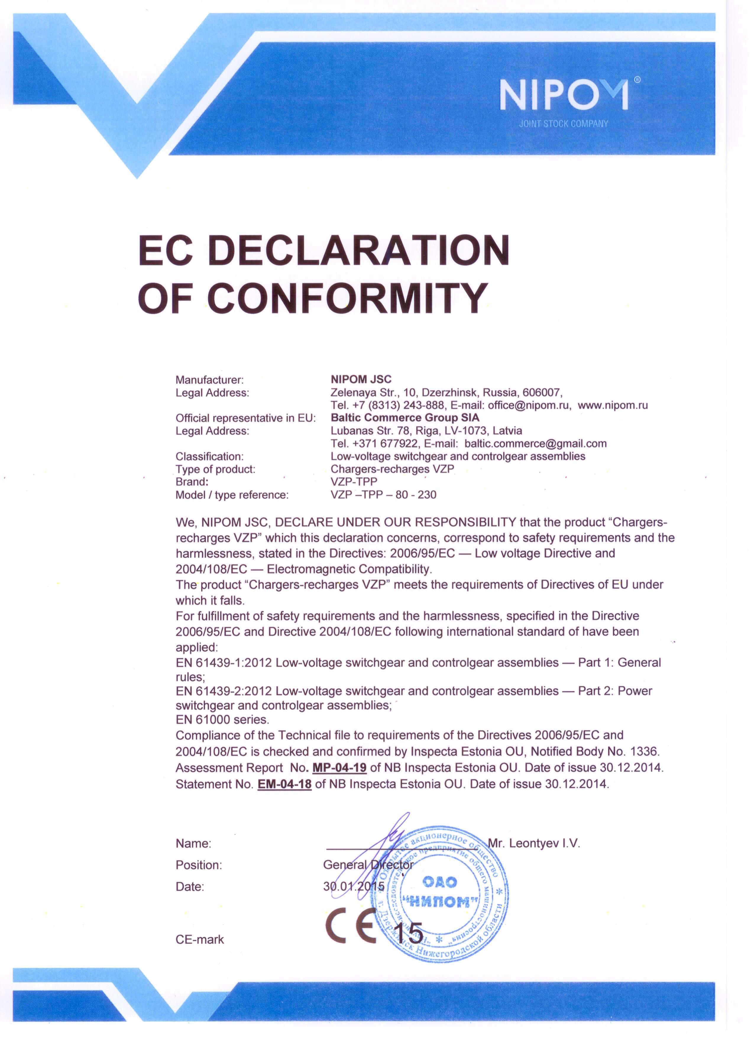 EC DECLARATION OF CONFORMITY - Chargers-recharges VZP
