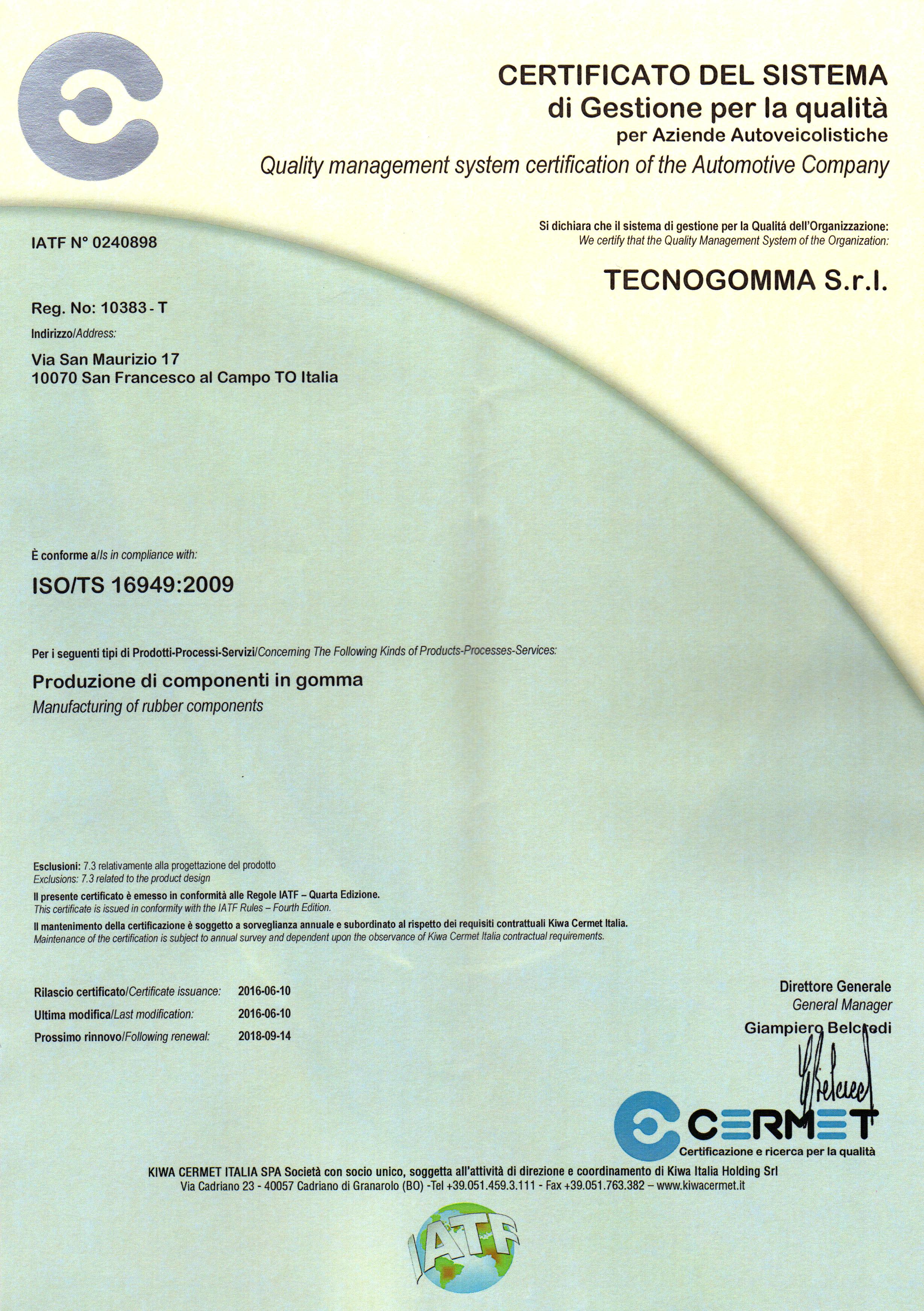 Tecnogomma s.r.l. ha implementato e mantiene un Sistema di Gestione Qualità conforme alla specifica ISO/TS 16949 sin dal 2013.