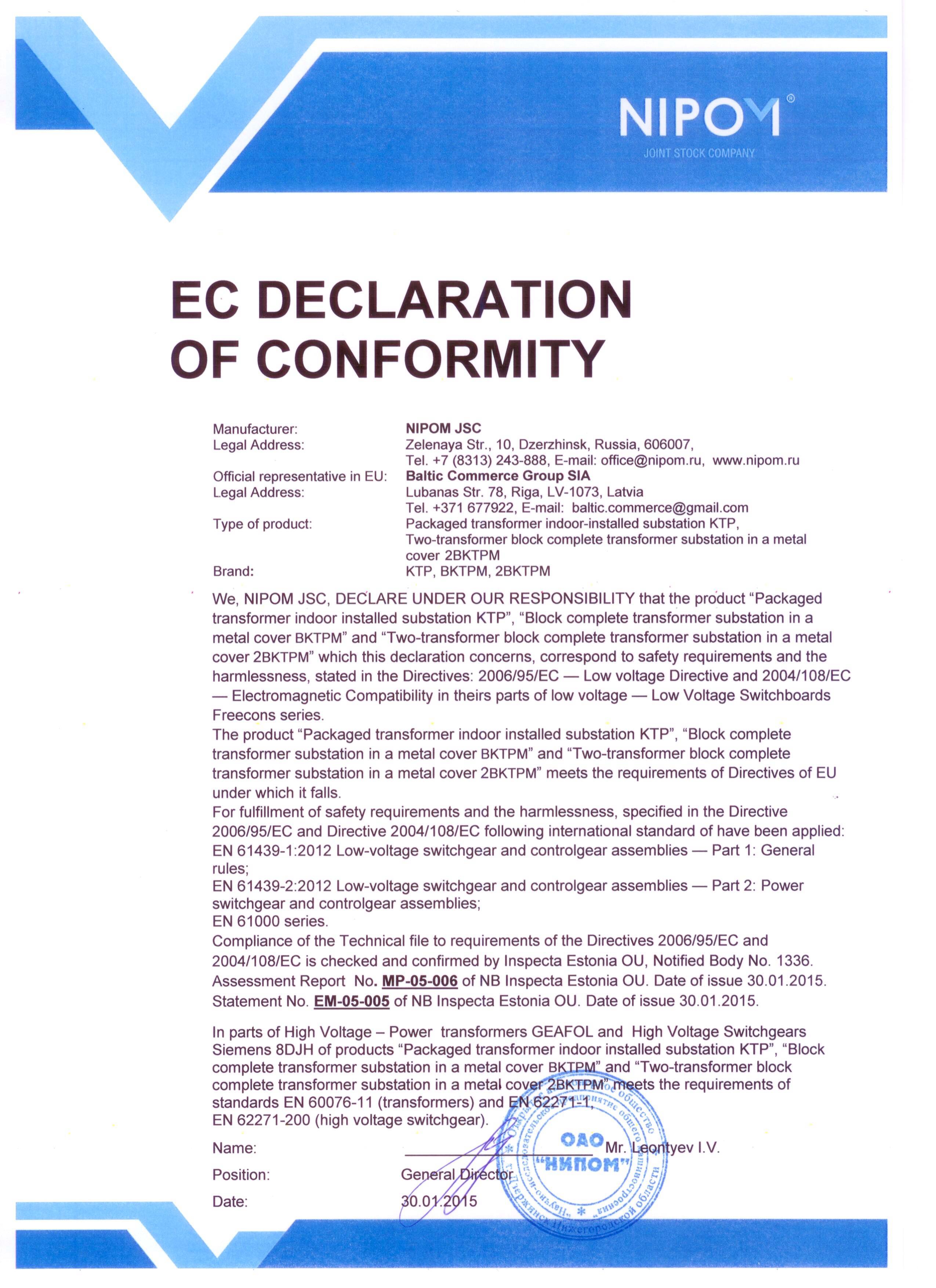 We, NIPOM JSC, DECLARE UNDER OUR RESPONSIBILITY that te product "Packaged transformer indoor installed substation KTP", "Block complete transformer substation in a metal cover BKTPM" and "Two-transformer block complete transformer substation in a metal co